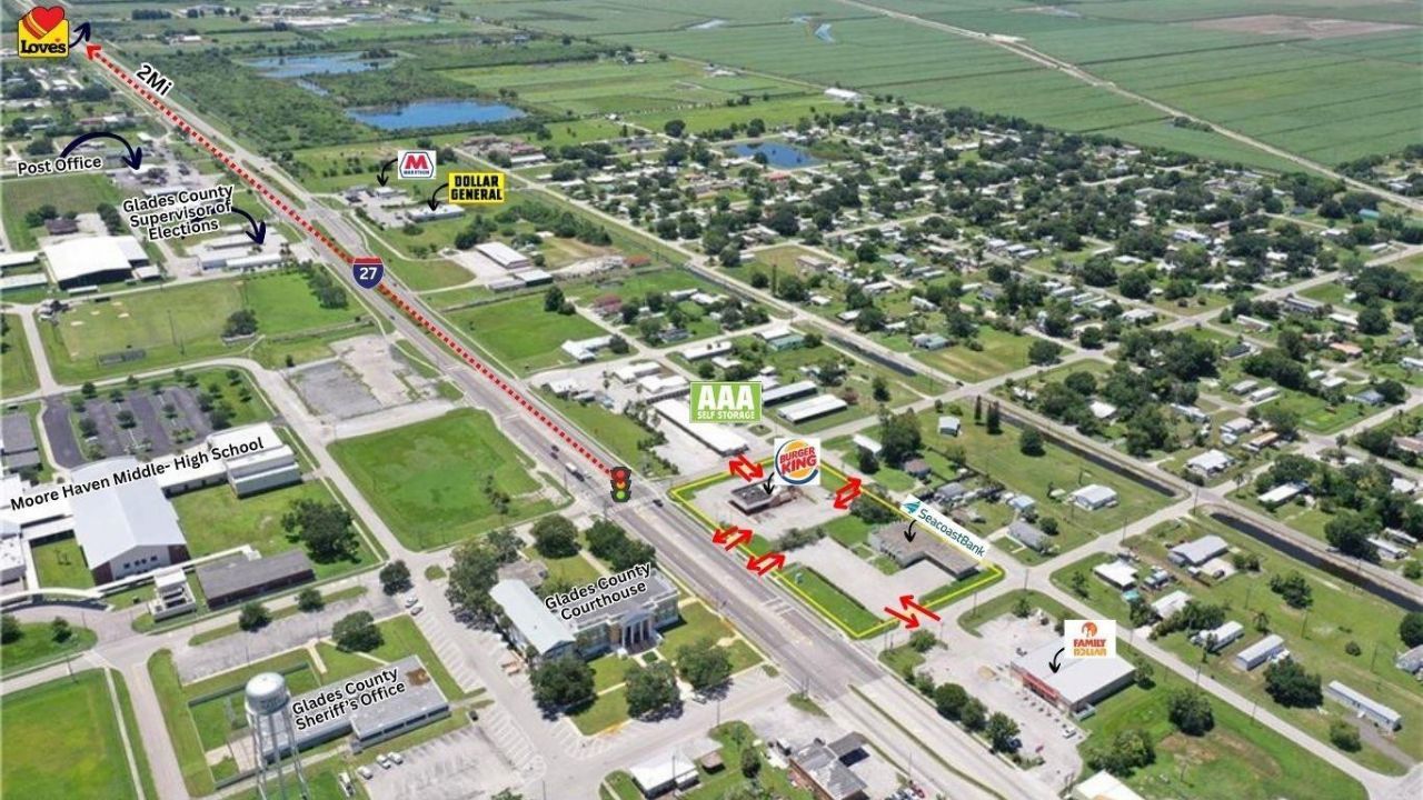 Two acre hard corner in the highest traffic count in Moore Haven. Prime real estate site across from county court house. parcel of two vacant buildings. Old Burger King restaurant and Seacoast Bank Building. Air Glades industrial center is close by. Great investment opportunity!